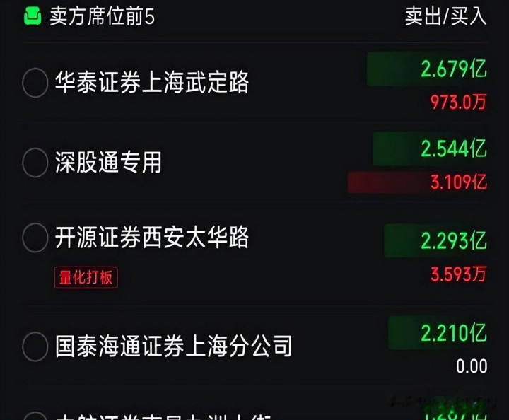 领头砸盘的,有好几家大券商的营业部,比如华泰证券上海武定路,卖了2.68亿;开源证券西安太华路,卖了2.29亿。