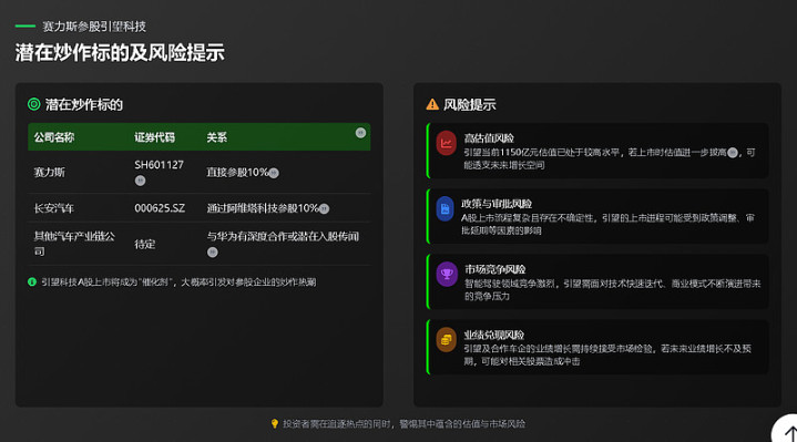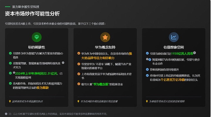 去年赛力斯发布百亿参股深圳引望科技的公告,现已完成过户手续。若深圳引望科技有限公司申请IPO上市,将是比宇数科技更受欢迎的新股。目前80%的车企已与华为合作,用华为的软硬件来解决汽车智能化的问题。引望作为ADS智驾软件和鸿蒙座舱软硬件供应商,成长空间巨大,市值上升潜力巨大。